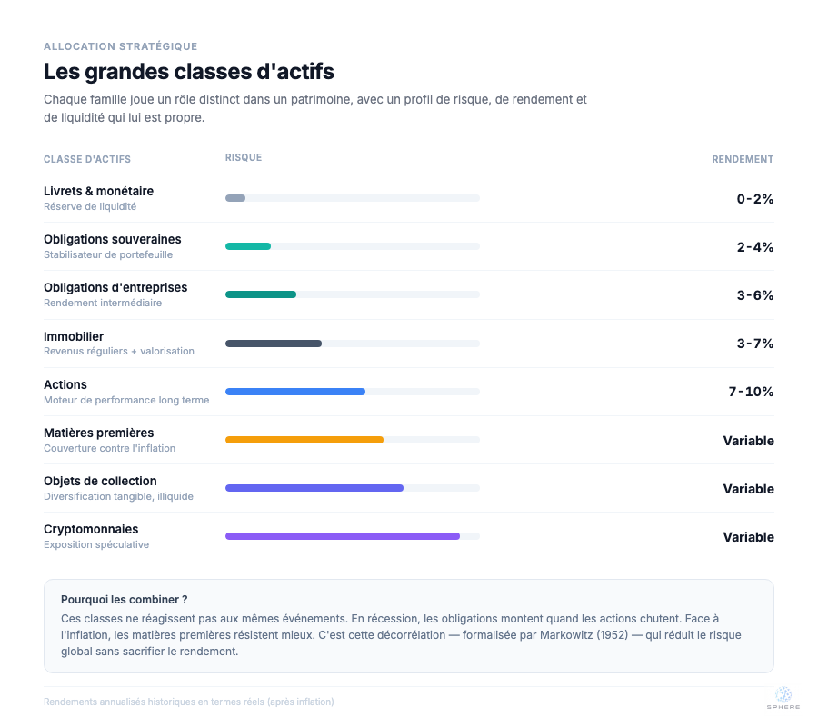 C'est cette question — la répartition entre grandes classes d'actifs — qu'on appelle l'allocation stratégique. Le choix précis de tel ou tel actif à l'intérieur de chaque classe relève, lui, de l'allocation tactique.